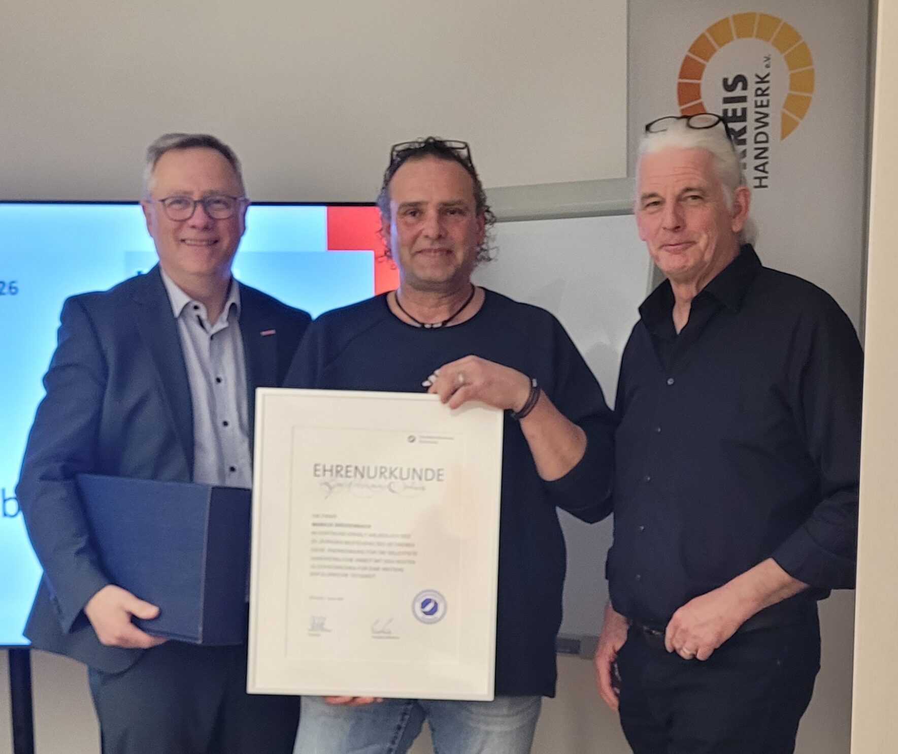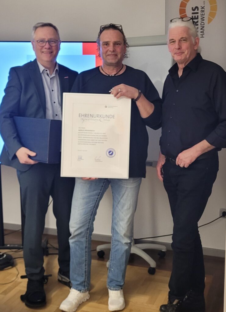 Im Rahmen der Innungsversammlung am 04.03.2026 überreichten Obermeister Pape und Innungsbeauftragter Susewind eine Urkunde anlässlich seines Geschäftsjubiläum und wünschten ihm für die kommenden Jahre weiterhin viel Erfolg und alles Gute.