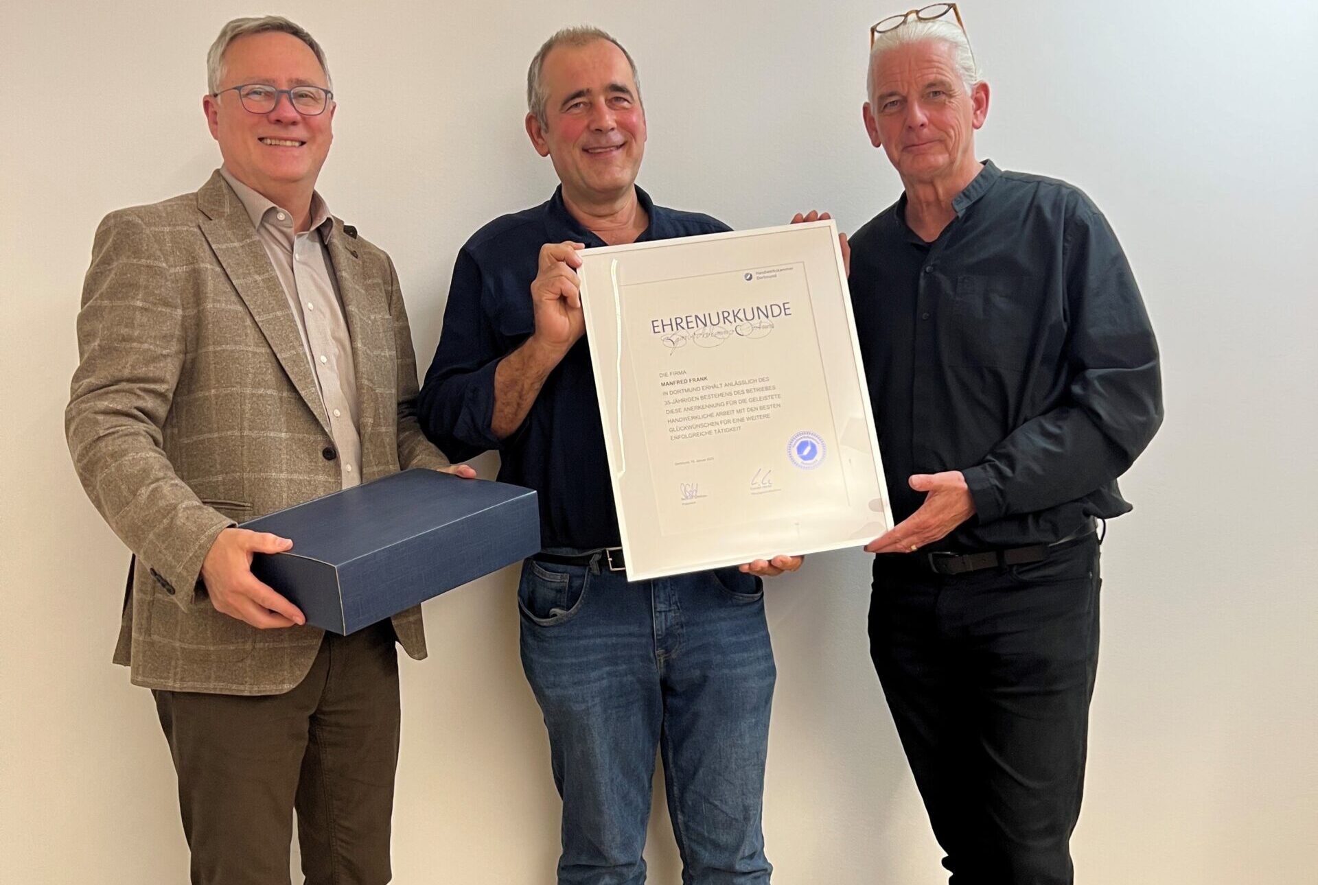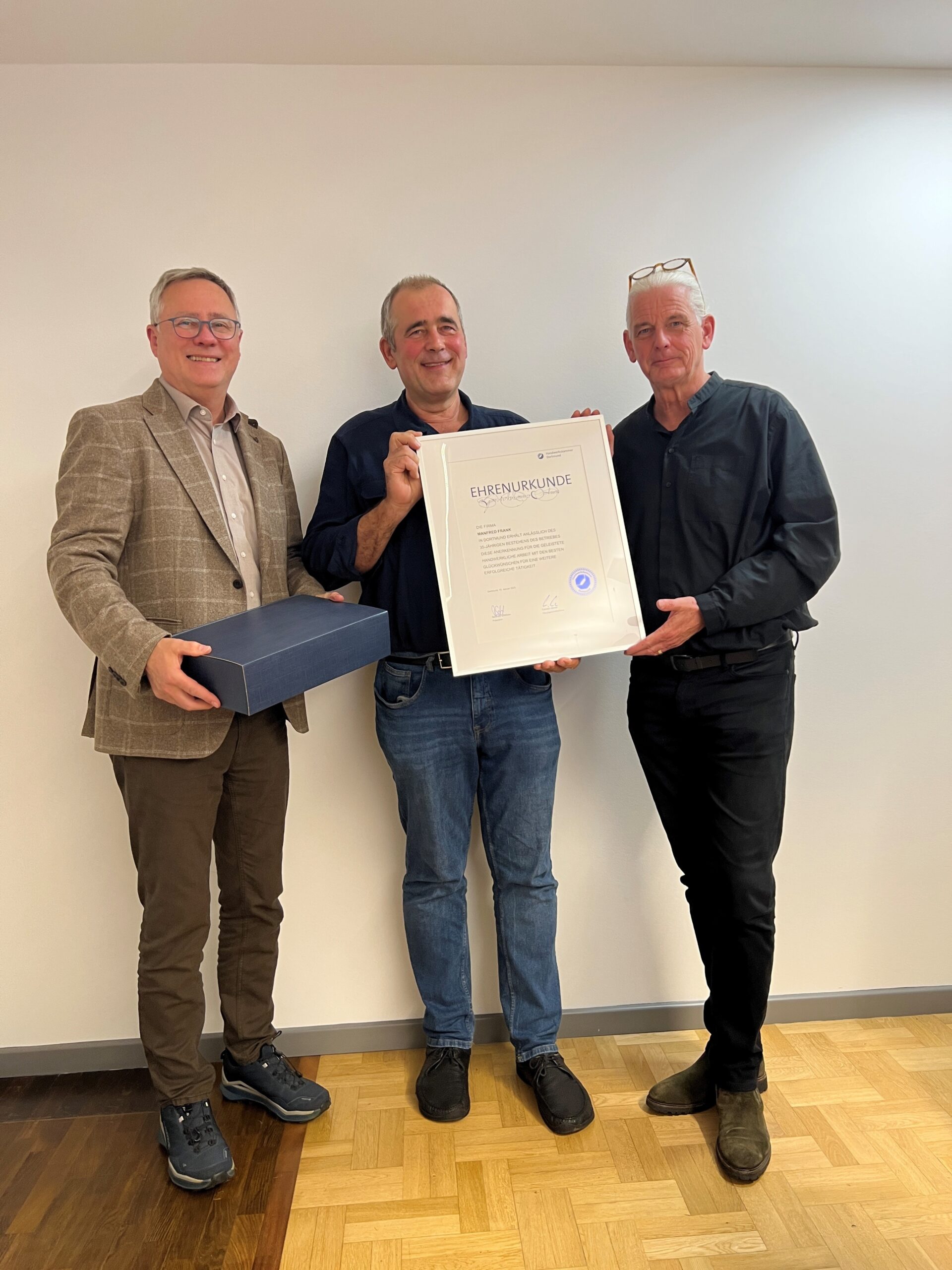 Manfred Frank feierte zu Beginn des Jahres sein 35-jähriges Geschäftsjubiläum. Aus diesem Anlass wurde ihm an diesem Abend die Ehrenurkunde der Handwerkskammer Dortmund sowie nachträglich der Silberne Meisterbrief überreicht. Obermeister Pape dankte ihm herzlich für seine langjährige ehrenamtliche Tätigkeit als Beisitzer im Vorstand der Innung. Seit 2024 engagiert sich Manfred Frank zudem als stellvertretender Arbeitgebervertreter im Gesellenprüfungsausschuss.