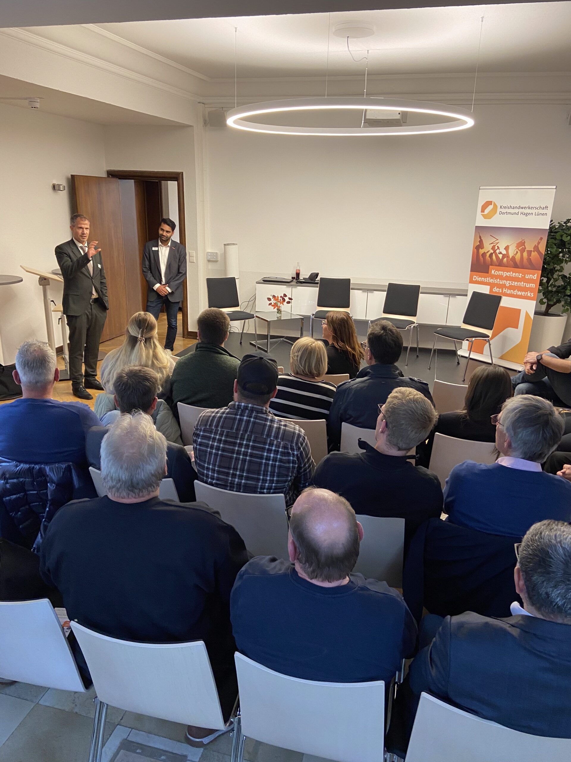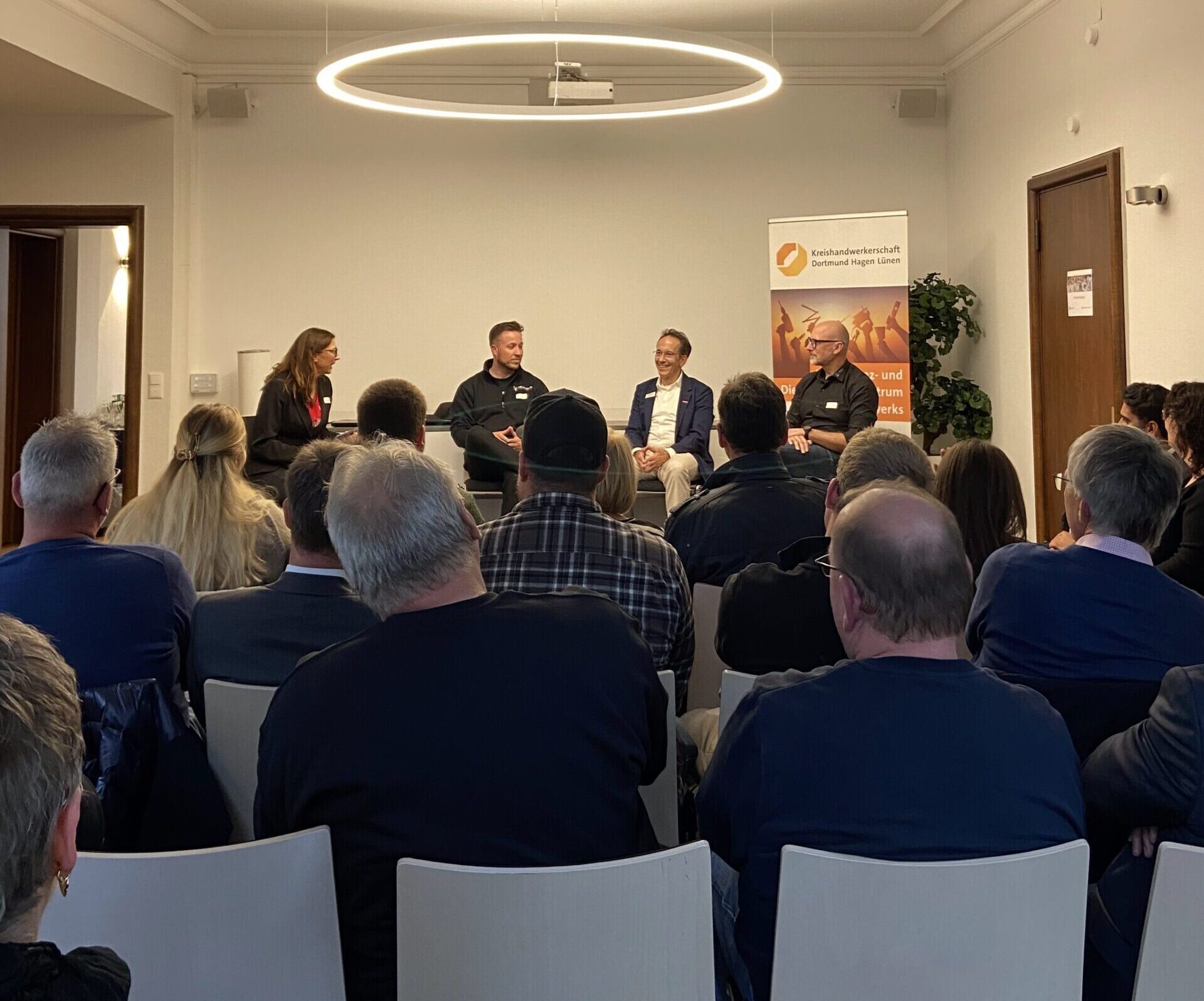 Den inhaltlichen Auftakt bildete ein Podiumsgespräch, moderiert von Constanze Schick. Die Gäste – Stephan Konertz (Syndikusrechtsanwalt, Kreishandwerkerschaft Dortmund Hagen Lünen), Caspar Putzke (Neuendorf Dächer und Fassaden, Breckerfeld) und Stefan Pauli (Malerbetrieb Pauli) – beleuchteten Nachfolge aus unterschiedlichen Perspektiven.